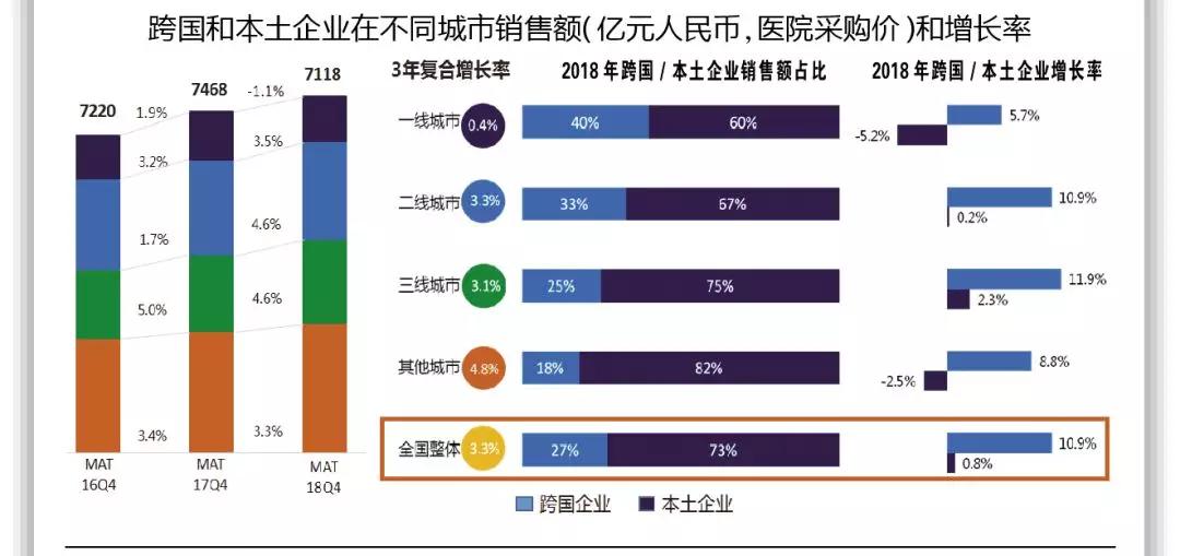 总体看,外企(进口或合资)药品销售增长2018年达10.9%,较大幅度下降的是本土企业用药,2018年同比增长仅0.8%。2019年,随着一致性评价陆续完成,临床用药监控、DRGs实施,实现市场增长极具挑战。