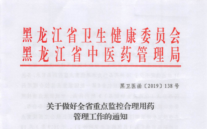 8月12日,黑龙江省卫健委、黑龙江省中医药管理局发布《关于做好全省重点监控合理用药管理工作的通知》(以下简称《通知》)。