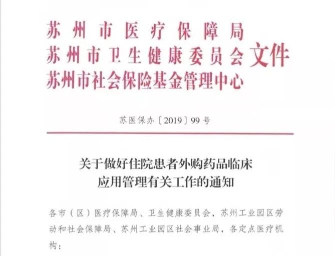 近日,苏州市医保局、苏州市卫健委、苏州市社会保险基金管理中心三部门联合发布《关于做好住院患者外购药品临床应用管理有关工作的通知》(以下简称《通知》)。
