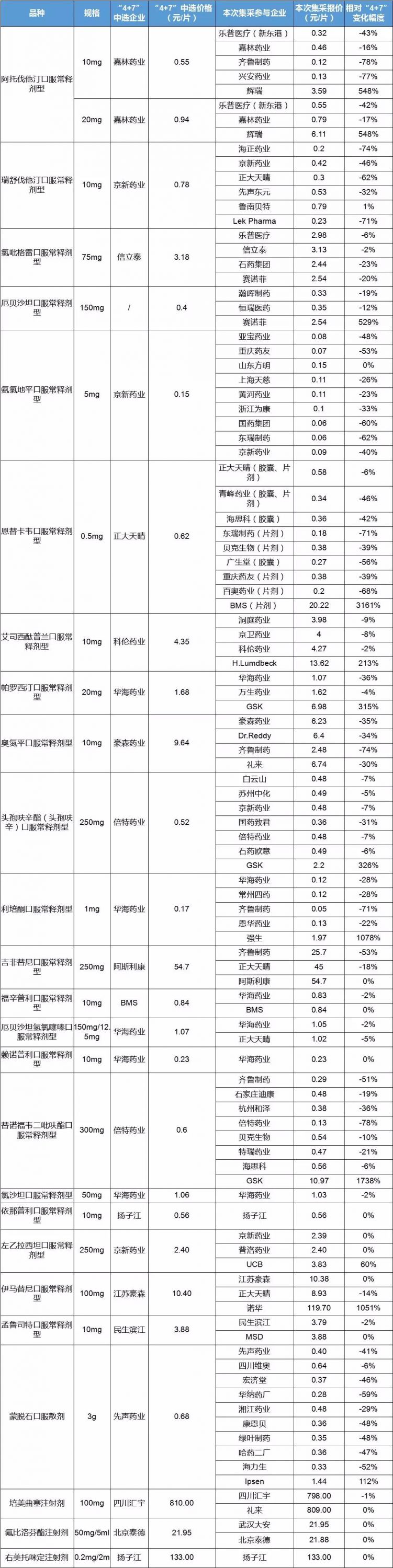本次“4+7”扩面的最大赢家应该还是华海药业,盐酸帕罗西汀片、利培酮片、福辛普利钠片等7个品种报价均为最低价的前三名。扬子江两大品种马来酸依那普利片、盐酸右美托咪定注射液由于没有竞争对手均选择不调价。另外,外企赛诺菲硫酸氯吡格雷片75mg报出2.55元/片,低于乐普和信立泰的报价,略高于石药2.44元/片的报价。另外,首轮唯二中标的两家外企,BMS、阿斯利康均以首轮中标价跟进,零降幅。