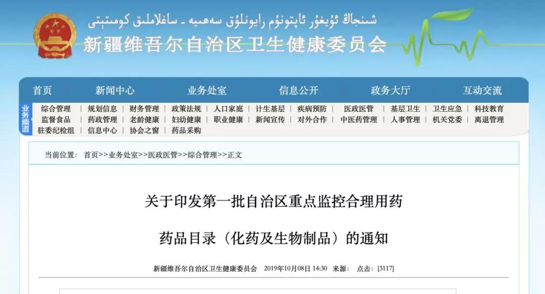 无独有偶,10月8日,新疆维吾尔自治区卫生健康委员会也印发了第一批自治区重点监控合理用药药品目录(化药及生物制品),16个品种被重点监控。