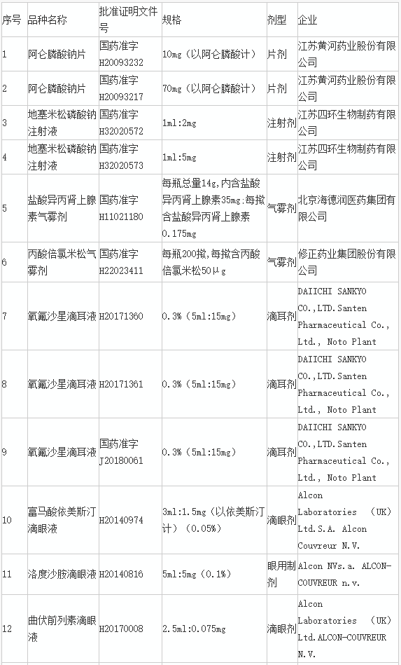 阿仑膦酸钠片、地塞米松磷酸钠注射液、盐酸异丙肾上腺素气雾剂、丙酸倍氯米松气雾剂、氧氟沙星滴耳液、富马酸依美斯汀滴眼液、洛度沙胺滴眼液、曲伏前列素滴眼液、梅毒甲苯胺红不加热血清试验诊断试剂等。