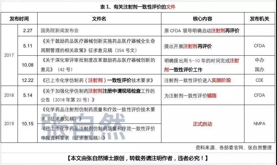自2017年2月27日,原CFDA领导在国新办发布会上明确启动注射剂再评价以来,有关注射剂一致性评价的文件也相继发布了一些,但始终没有具体细则,昨天《化学药品注射剂仿制药质量和疗效一致性评价技术要求(征求意见稿)》的发布,将正式开启注射剂一致性评价工作。