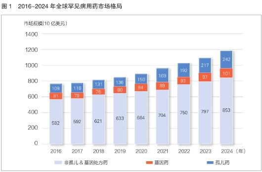 近年来,罕见病用药研发已成为新药研发的主战场。数据显示,2018年全球罕见病用药市场规模为 1310 亿美元,并以12.3%的年复合增长率快速增长,预计到2024年,罕见病用药市场规模将达到2420 亿美元(见图1)。罕见病用药市场增速是同时期非罕见病用药市场增速(6%)的两倍,预计到2024年,罕见病用药在处方药市场中的占比将首次突破20%。
