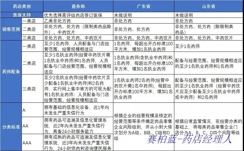 而商务部、广东省及山东省出台的政策中,除了均通过对药店评级来限定其销售范围外,同时又有所区别。