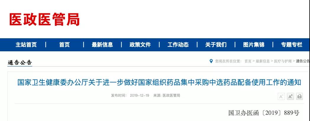 12月19日,国家卫健委发布《关于进一步做好国家组织药品集中采购中选药品配备使用工作的通知》(以下简称《通知》)。