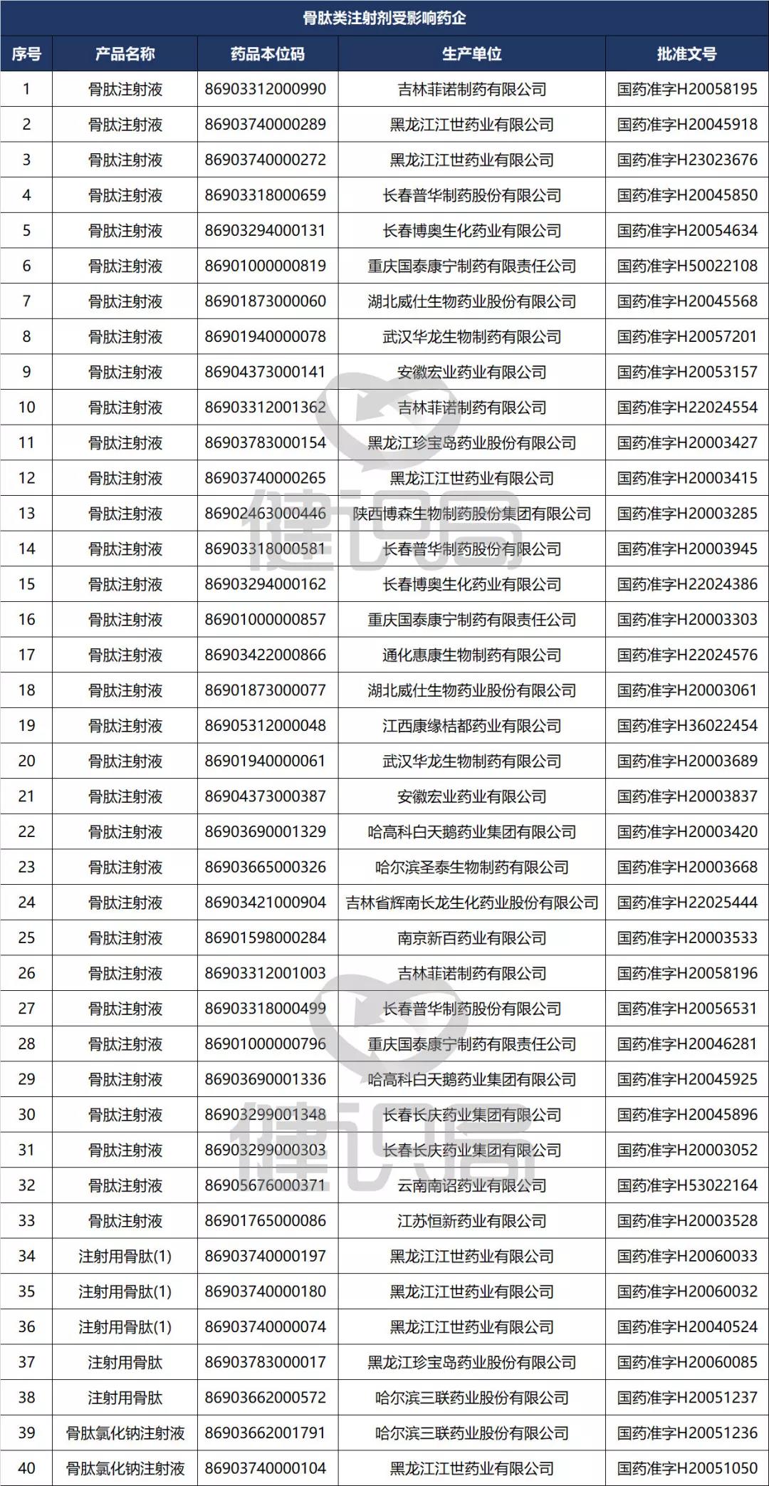 健识局在国家药监局搜索发现,相关骨肽注射剂达40种。涉及厂家包括长春普华制药、南京新百、哈尔滨三联药业、珍宝岛药业等数十家企业。