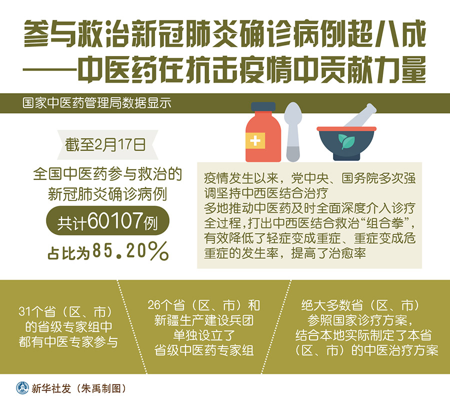 国家中医药管理局数据显示,截至2月17日,全国中医药参与救治的新冠肺炎确诊病例共计60107例,占比为85.20%。疫情发生以来,党中央、国务院多次强调坚持中西医结合治疗。多地推动中医药及时全面深度介入诊疗全过程,打出中西医结合救治“组合拳”,有效降低了轻症变成重症、重症变成危重症的发生率,提高了治愈率。