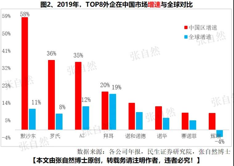 默沙东2019年在中国市场的增速高出其全球增速(10.8%)48个百分点,其他高出全球增速幅度较大的依次是罗氏(高出28%)、AZ(高出23%)和辉瑞(高出12%)。(图2)