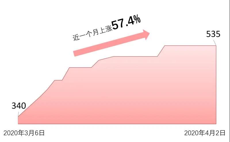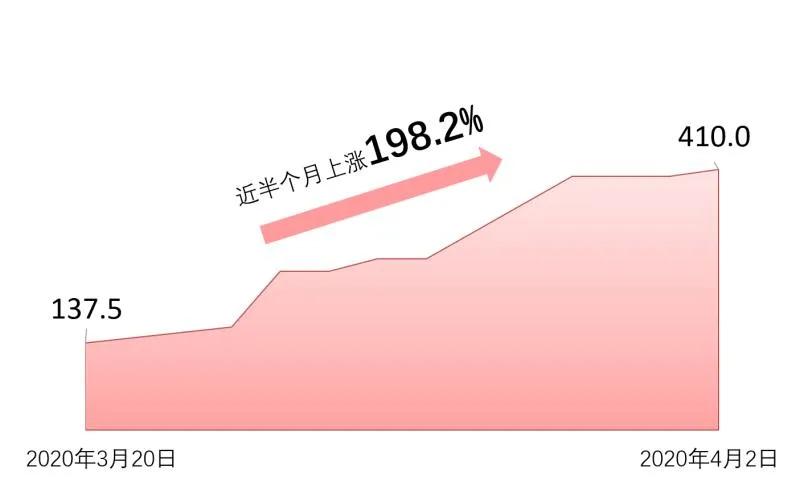 维生素D3近三个月价格上涨343.2%。其涨幅主要集中在近半个月,从3月20日的137.5元/千克上涨至4月2日的410元/千克,近半个月涨幅高达198.2%。