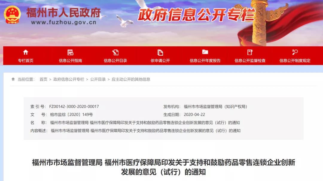 近日,福建福州市印发了《关于支持和鼓励药品零售连锁企业创新发展的意见(试行)》(以下简称《意见》),并就零售药店的发展提出了11项鼓励政策。