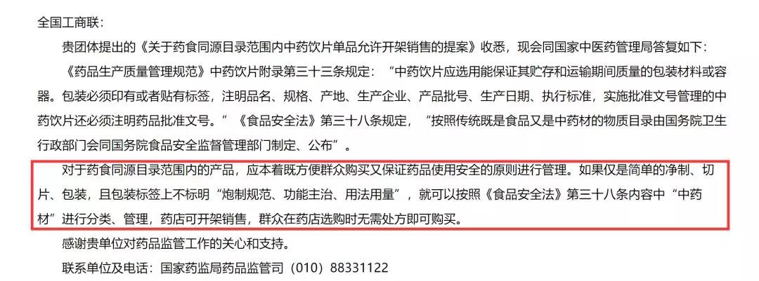 去年10月15日,国家药监局就全国工商联提出的“关于药食同源目录范围内中药饮片单品允许开架销售的提案”给出了明确的答复。